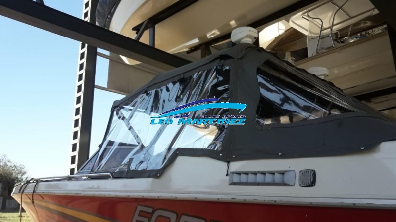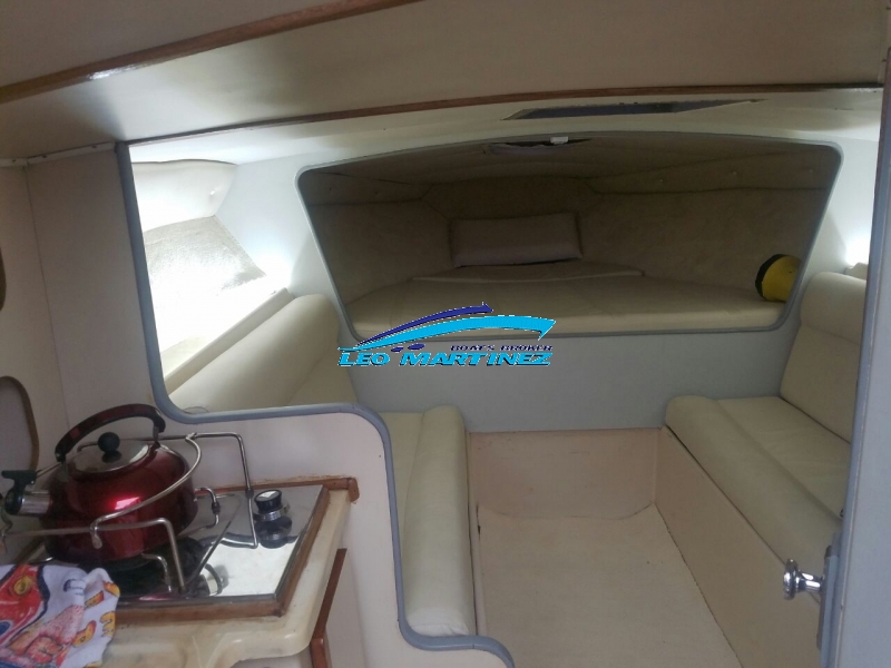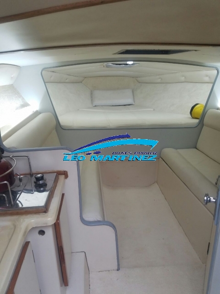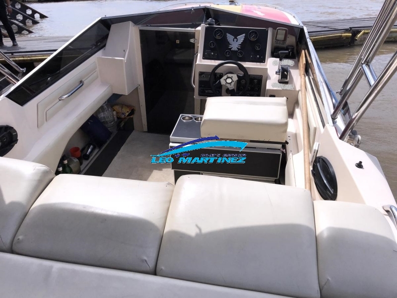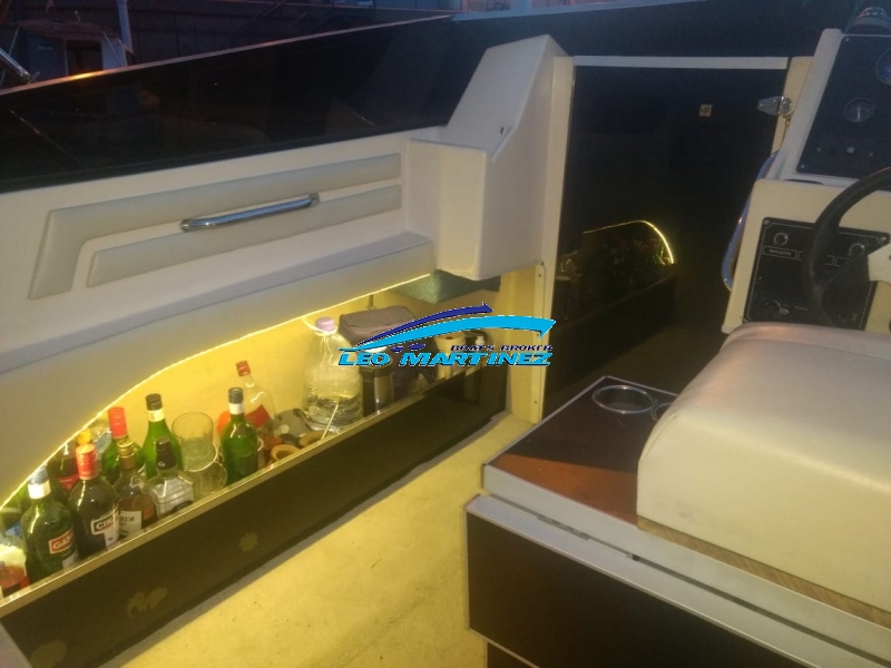 | Equipamiento: | Instrumental completo, VHF, ecosonda, audio, corta corriente, iluminacion, anafe, flaps, arco radar, instalacion 220 volt, toldilla, bomba de achique. Cama doble en proa, asientos enfrentados, servicios a babor, baño compartimentado a estribor, cockpit con butacas, asiento entero en popa, solarium a popa, planchada con escalera, cerramiento cristal. |