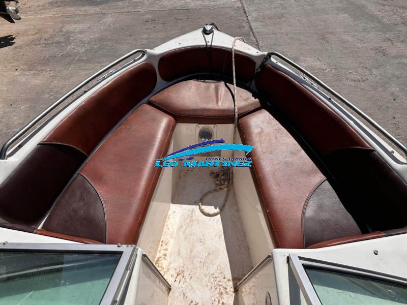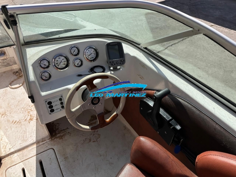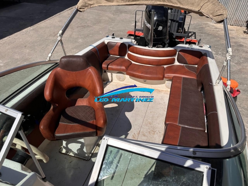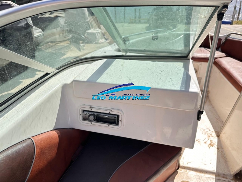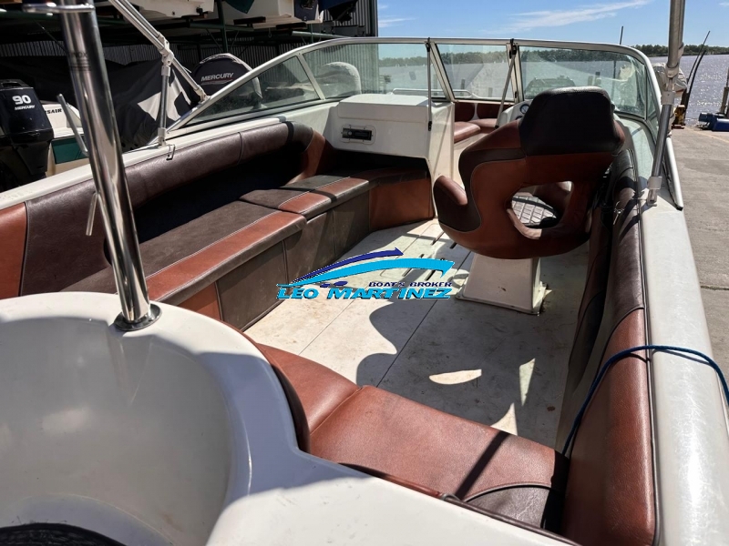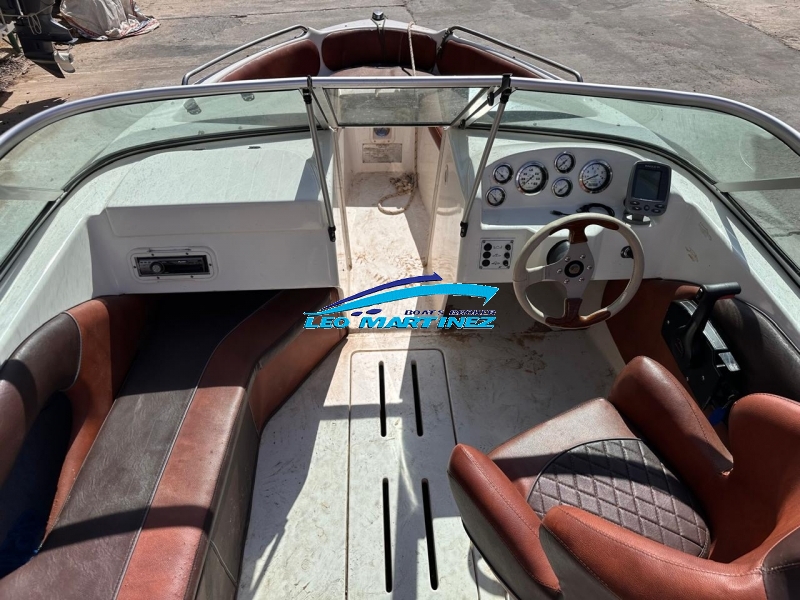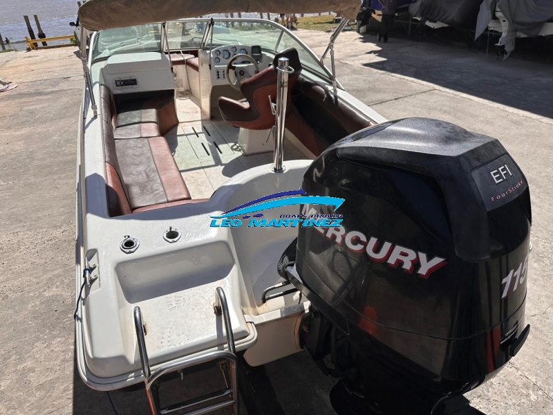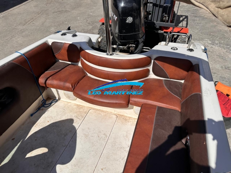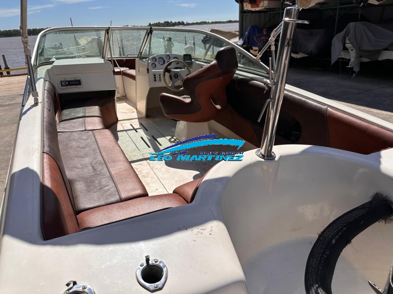 | Equipamiento: | Instrumental completo, ecosonda, audio, bomba de achique, corta corriente, butaca de timonel giratoria, asiento tipo sky de acompañantes, asientos en popa, guarda sky, tanque de combustible interno (80 lts.), guardamancebos en proa, tambuchos en proa y popa, toneau de proa, toldilla, barra de sky, posa cañas, escalera. |